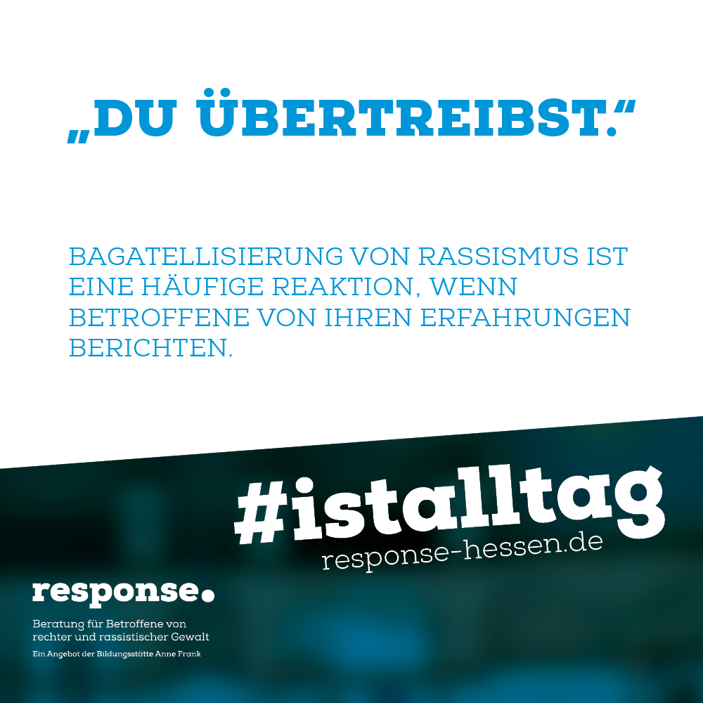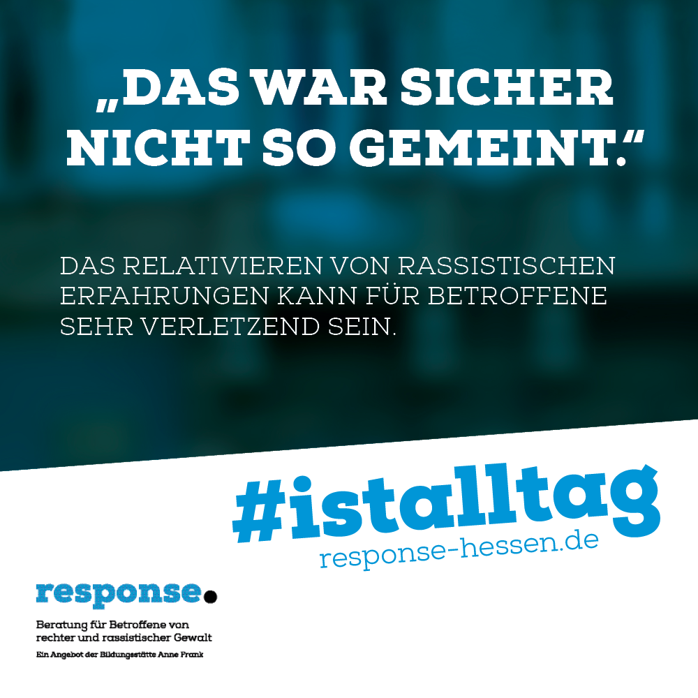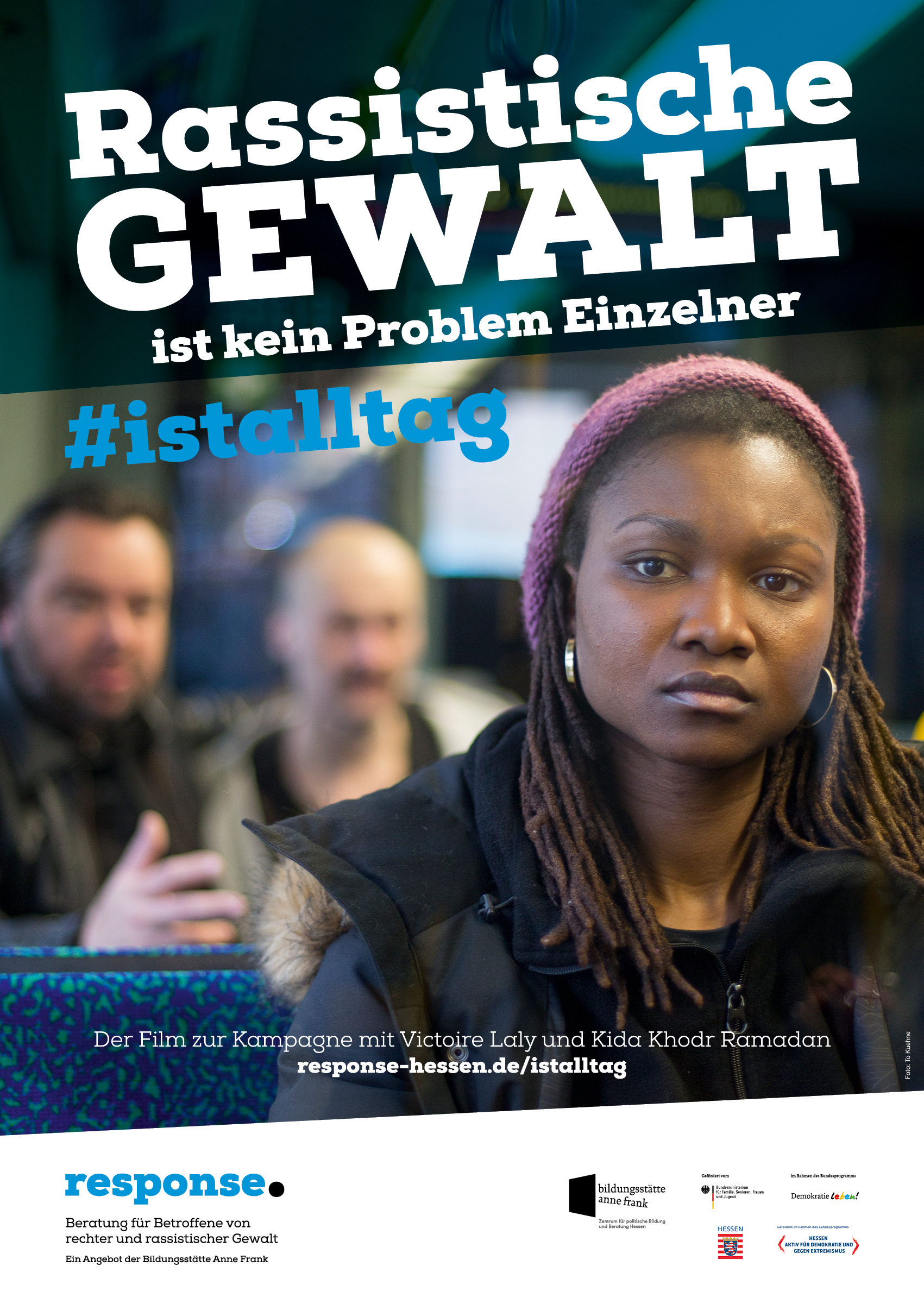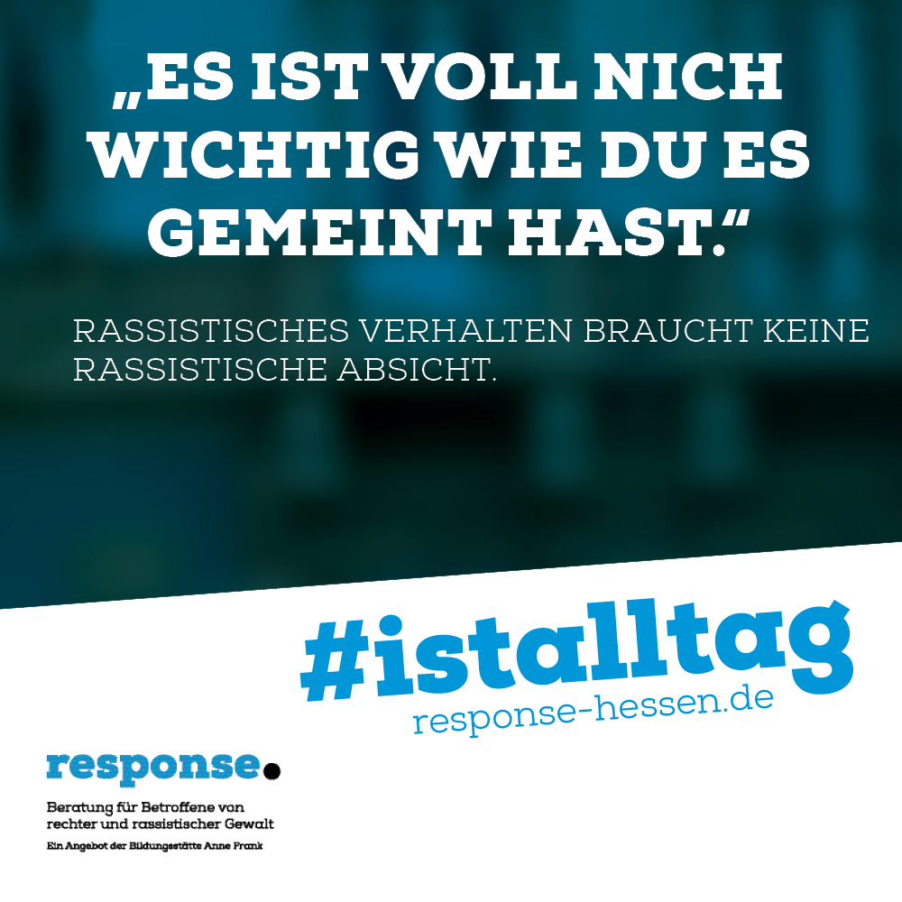 response ist die hessische Beratungsstelle für Betroffene von rechter, rassistischer und antisemitischer Gewalt. response und die Kampagne #istalltag werden gefördert im Rahmen des Bundesprogramms „Demokratie leben!“ durch das Bundesministerium für Familie, Senioren, Frauen und Jugend sowie im Rahmen des Landesprogramm „Hessen – aktiv für Demokratie und gegen Extremismus“ durch das Hessische Ministerium des Innern und für Sport.